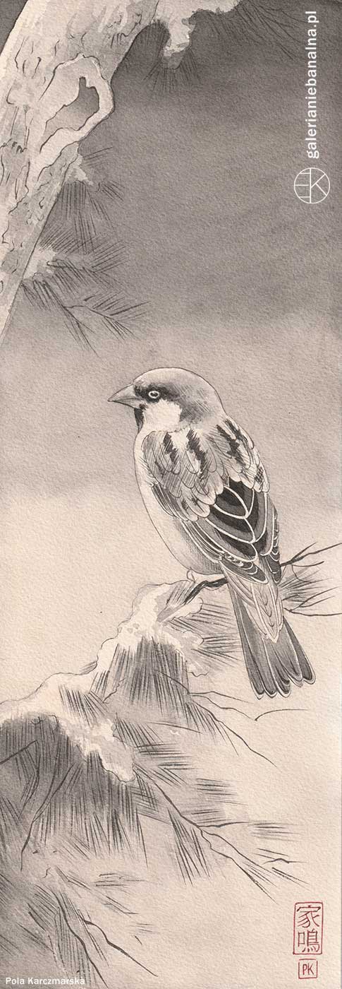 Długa ilustracja w formacie 42 cm na 14,8 cm z motywem natury. Wykonana w szarościach tuszem na papierze bawełnianym. Przedstawia wróbla (suzume), symbolizującego dziecięcą niewinność, radość i drobne szczęście. W Kraju Kwitnącej Wiśni ptaki mają bardzo bogatą i wielowarstwową symbolikę w sztuce japońskiej, zarówno w malarstwie, drzeworytach, jak i w literaturze i poezji. Każdy gatunek może mieć inne znaczenie w zależności od kontekstu, pory roku czy filozofii buddyjskiej.